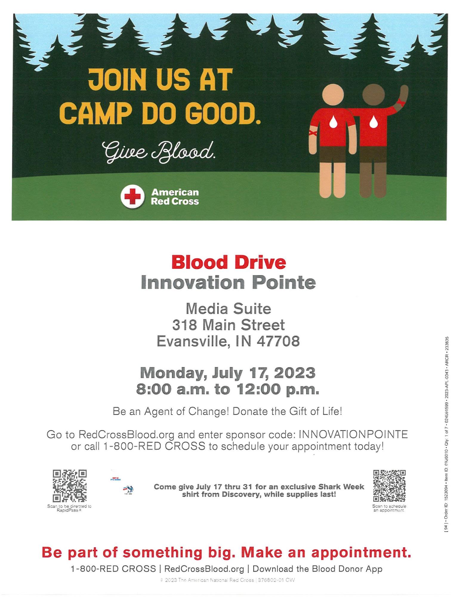 Join us on Monday, July 17th, 2023 for American Red Cross Blood Drive at Innovation Pointe (Media Suite). Please go to RedCrossBlood.org and enter sponsor code: INNOVATIONPOINTE or call 1-800-RED CROSS to schedule your appointment today!