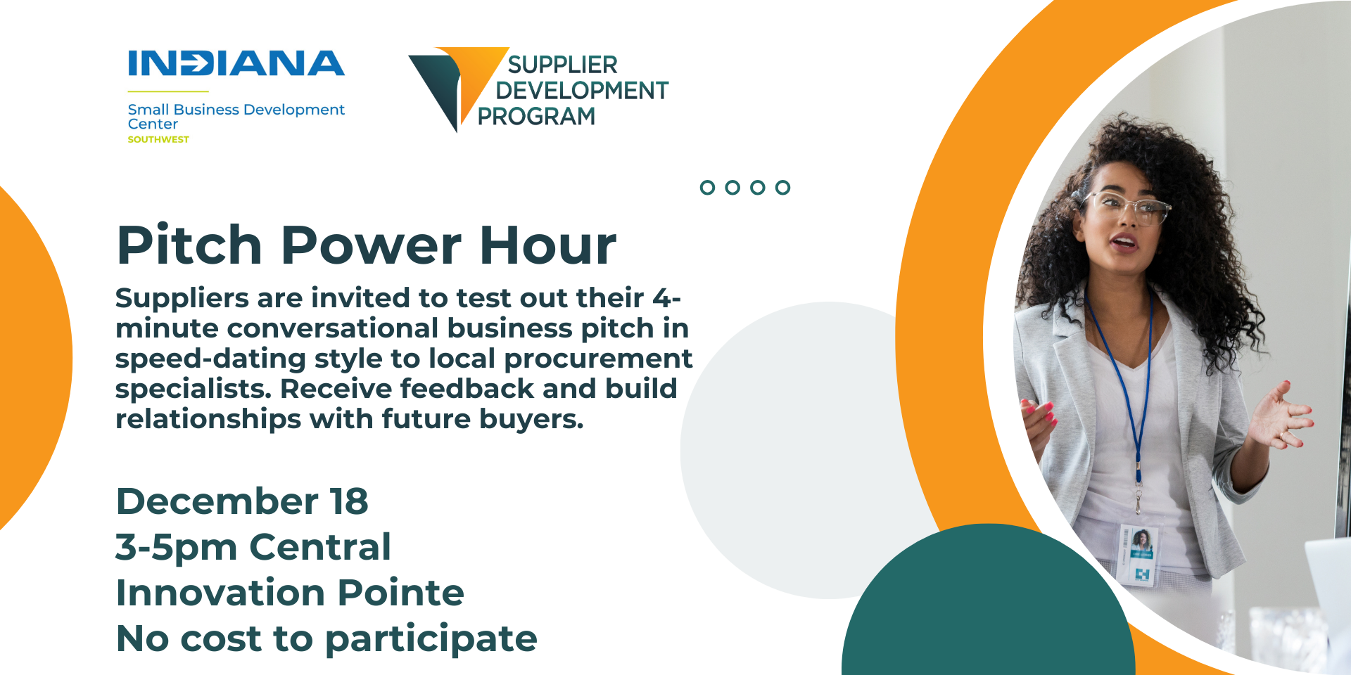 To prepare, we recommend attending our no cost Pitch Perfect Workshop on December 11, from 12pm to 3pm. Suppliers can also connect with a business advisor to refine their pitch. Contact us at southwest@isbdc.org or call 812-425-7232 to get matched with an advisor.