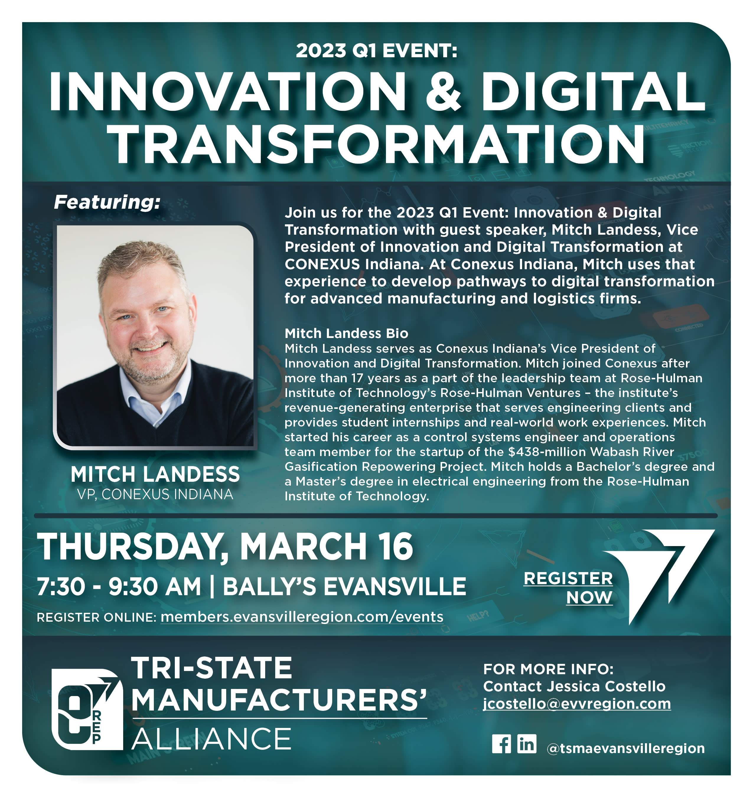 Join us for the 2023 Q1 Event: Innovation & Digital Transformation with guest speaker, Mitch Landess, Vice President of Innovation and Digital Transformation at CONEXUS Indiana. At Conexus Indiana, Mitch uses that experience to develop pathways to digital transformation for advanced manufacturing and logistics firms.